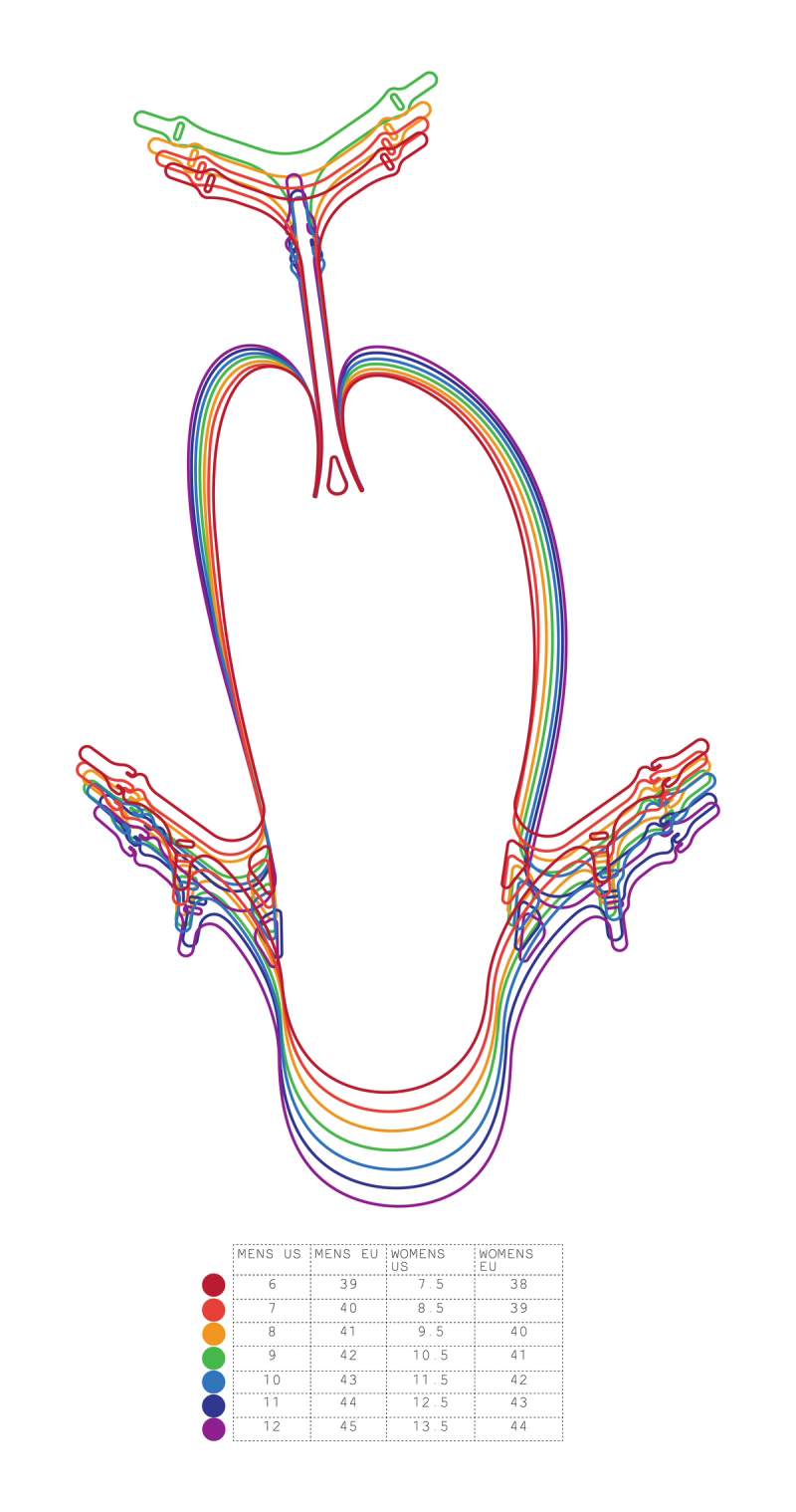 Sizes 6-9 (Men’s): two footprints and two back straps Sizes 10-14 (Men’s): two footprints, two y-straps, two backstraps. Larger sizes have a separate piece at top of strap due to 3D printer print-bed limitations.