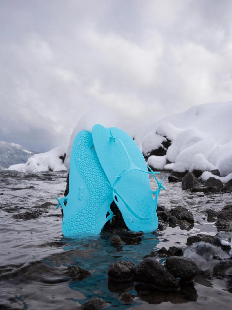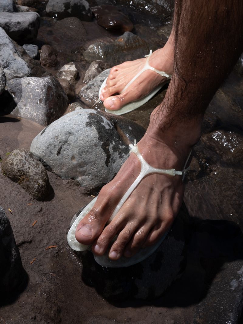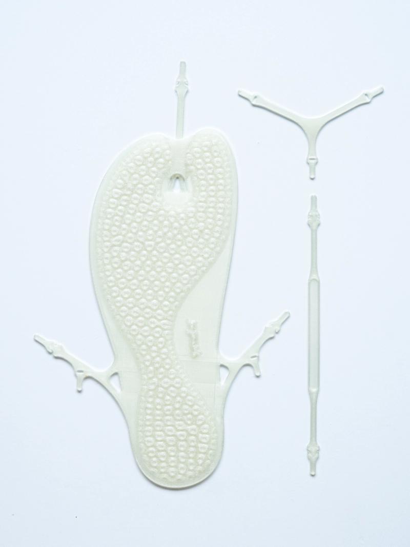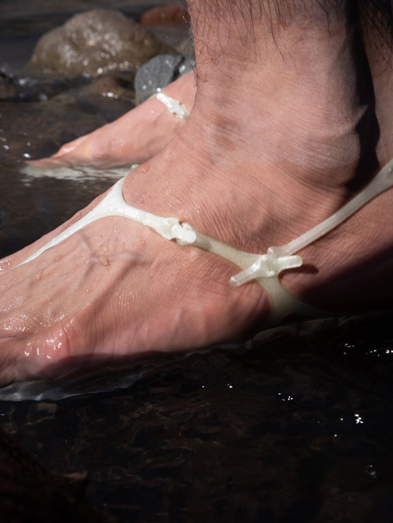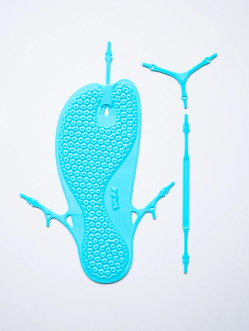 Each pair is 3D printed in Portland, Oregon, using a process that eliminates cutting and gluing, reducing waste and keeping production local. Each sandal has an anchor tab assembly system, with 4-5 (depending on size) connection points, which need to be put together by the wearer before use. Simple, functional, and made with just one material.