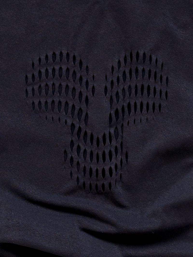 Made in Italy using warp knit seamless construction with engineered perforations. Using Econyl yarn, made entirely from post consumer waste resources, such as discarded fishing nets, fabric scraps, carpet flooring, and industrial plastic, which are transformed into a nylon yarn boasting the same quality and performance as virgin nylon. The regenerated yarn can be recycled, recreated, and remolded into new products.