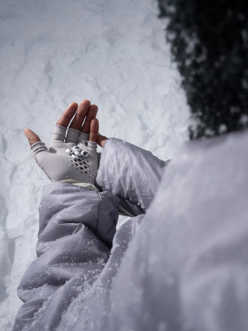 The Warp Kit Rest includes gloves/sleeves, ankle gaiters/calf-sleeves, and a neck gaiter—each knit from the same custom-engineered warp panel as the vest (sold separately). Designed with a reduced-waste approach, every piece shares the same breathable stretch and seamless construction.